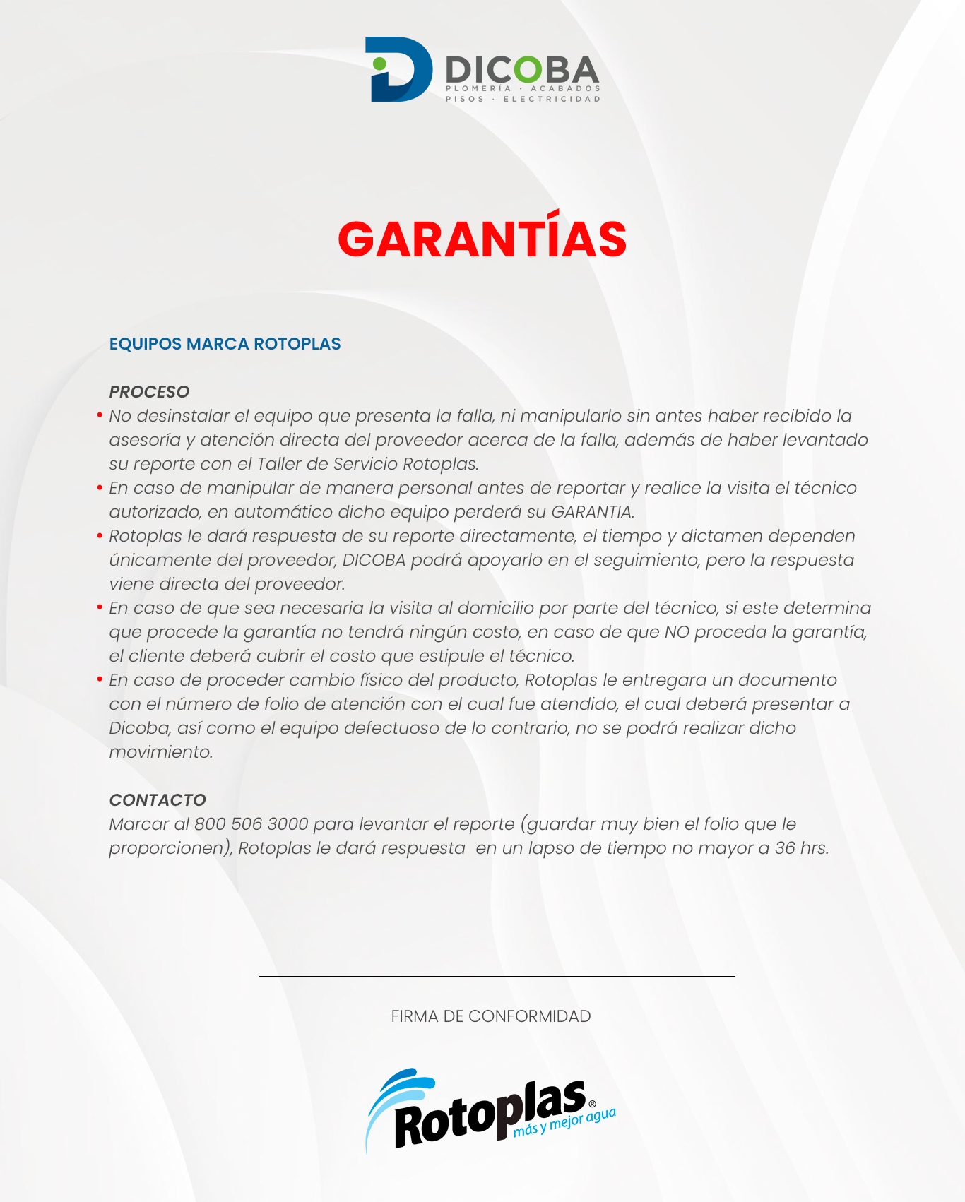 En caso de proceder cambio físico del producto, Rotoplas le entregara un documento con el número de folio de atención con el cual fue atendido, el cual deberá presentar a Dicoba, así como el equipo defectuoso de lo contrario, no se podrá realizar dicho movimiento.