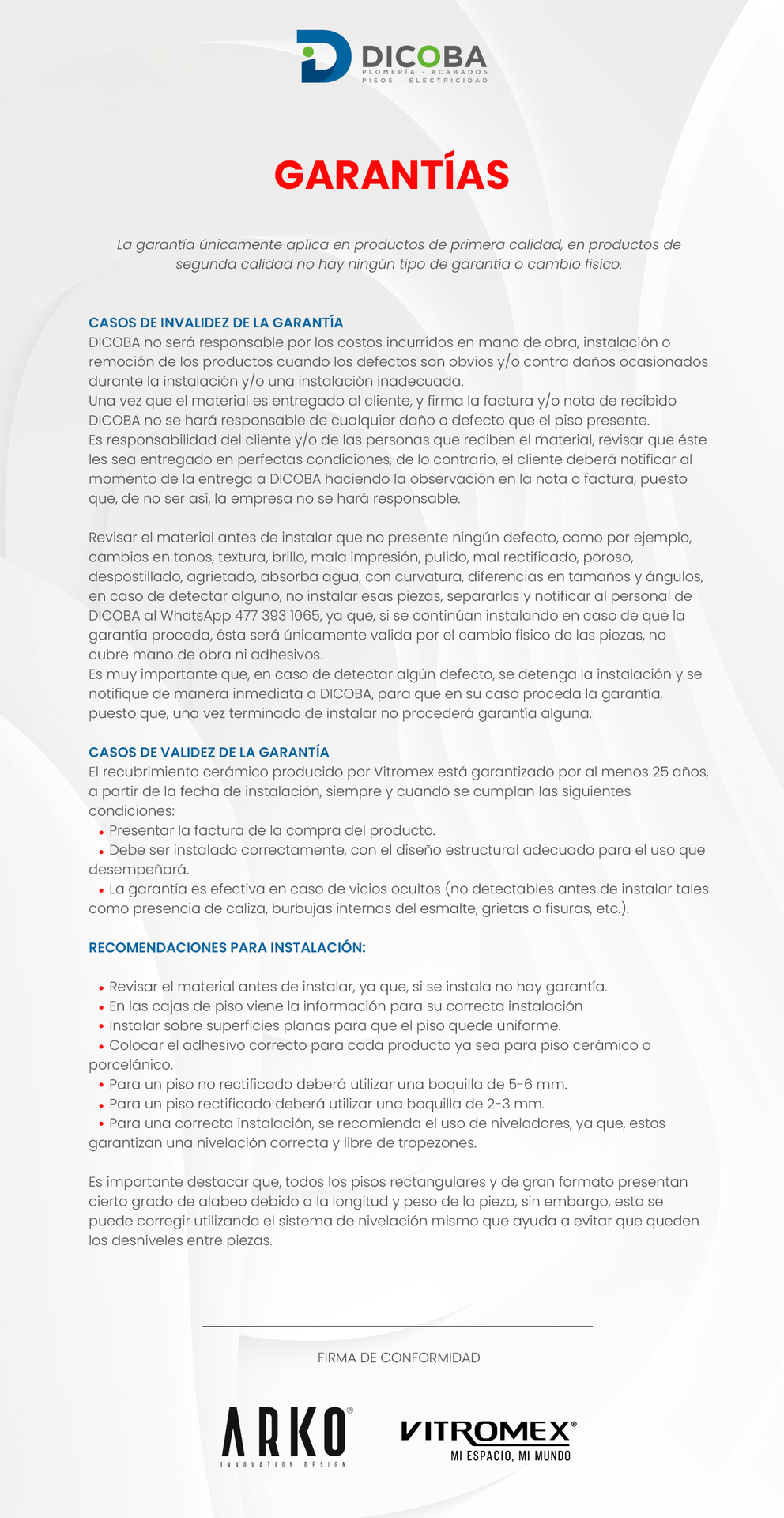*Una vez que el material es entregado al cliente, y firma la factura y/o nota de recibido DICOBA no se hará responsable de cualquier daño o defecto que el piso presente.